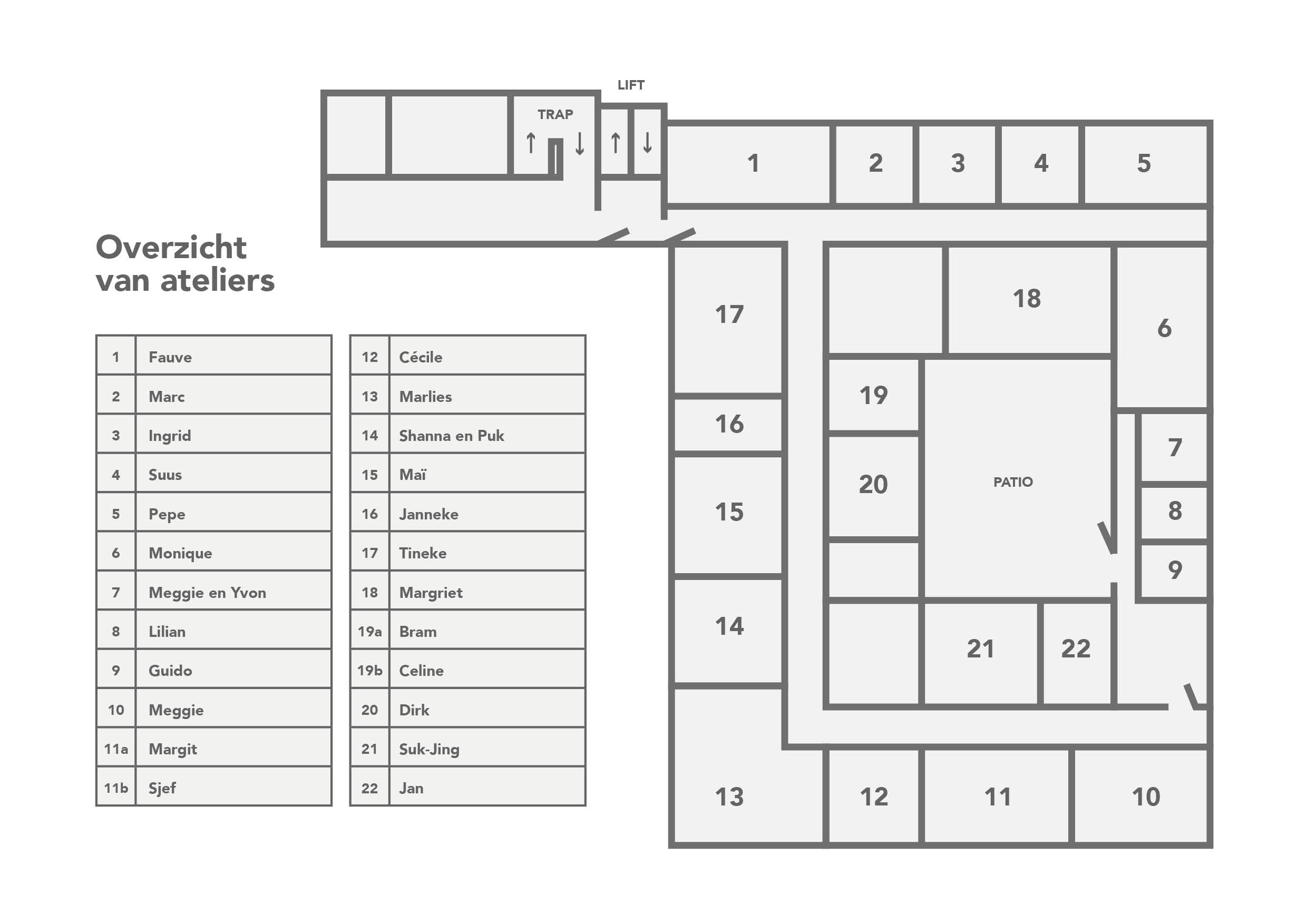 Op ‘de top floor‘ zijn ateliers voor beeldend kunstenaars, ontwerpers, glasbewerkers, illustratoren en performers.