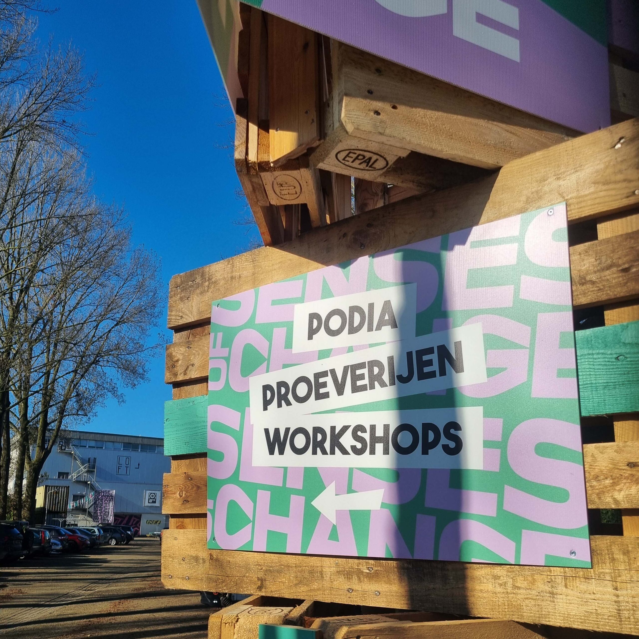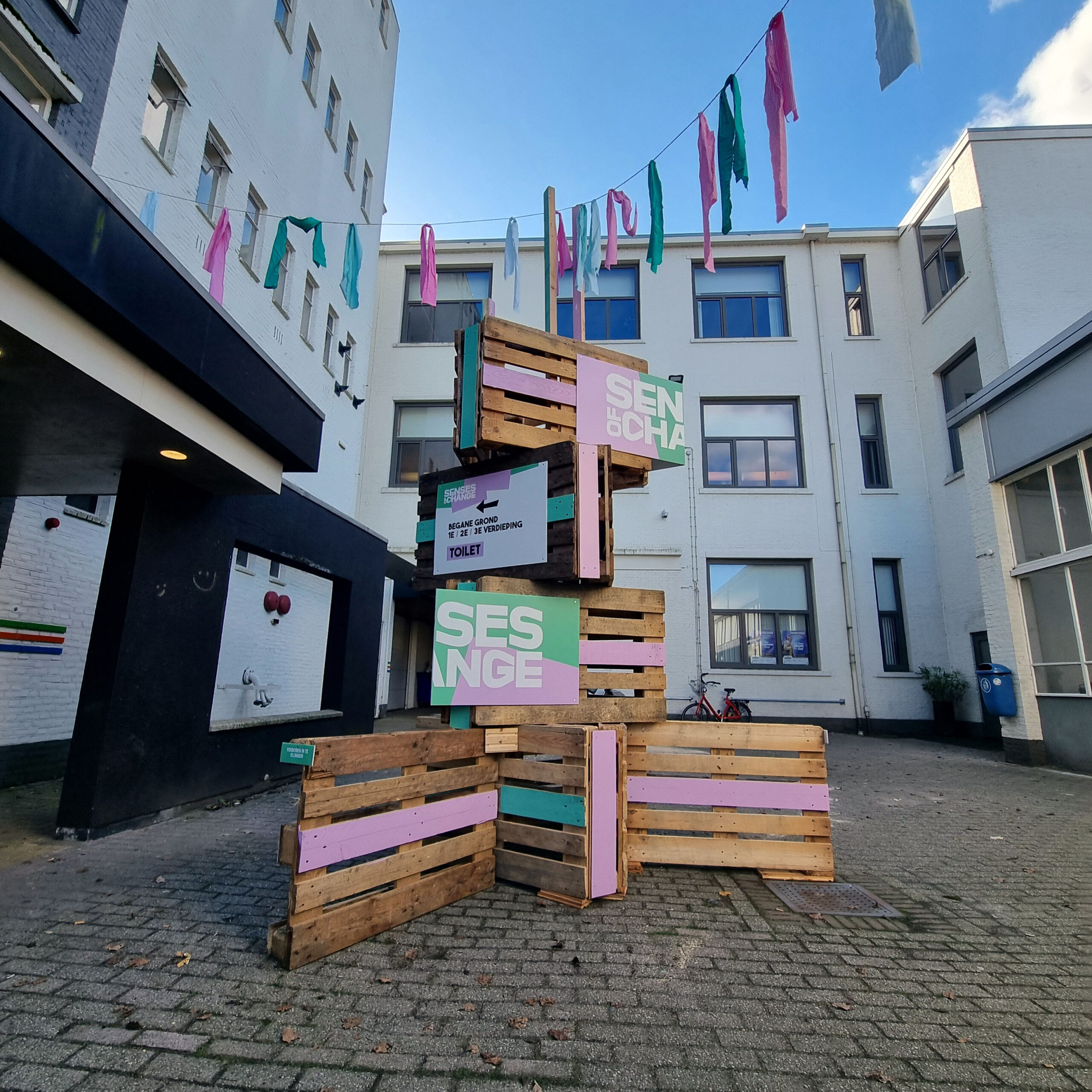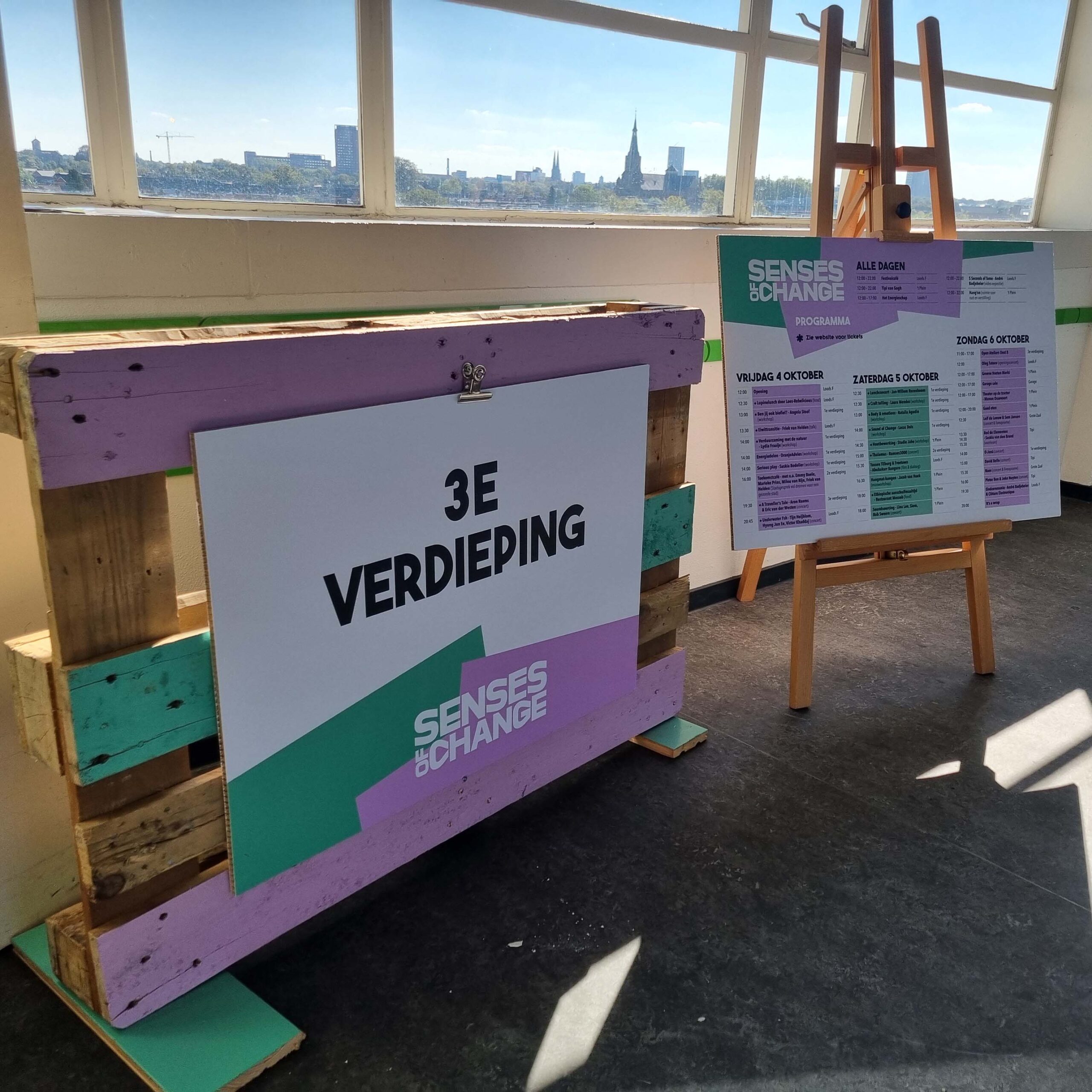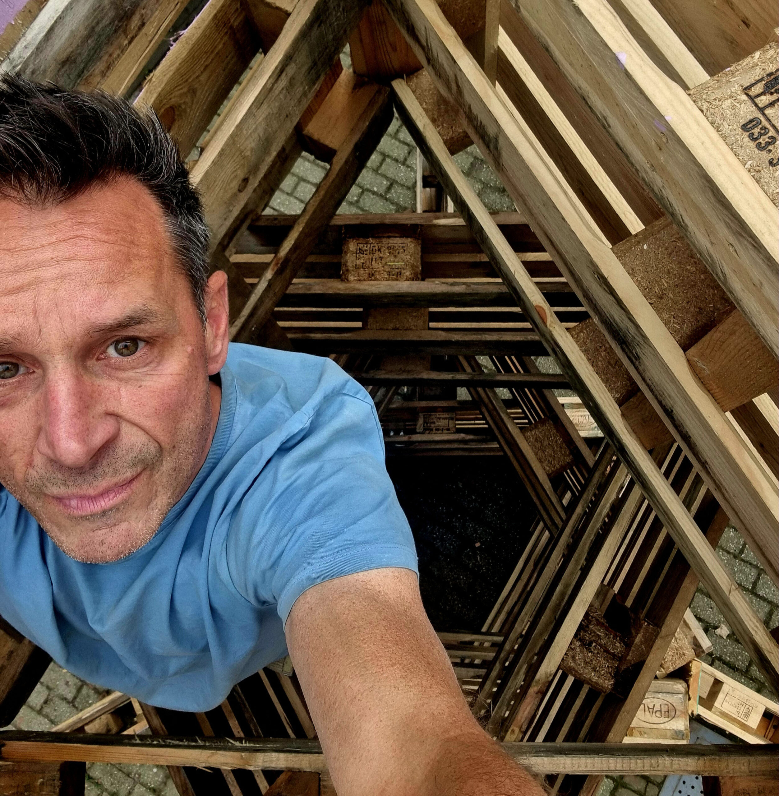 Naast het maken van grafische en ruimtelijke communicatiemiddelen help ik graag mee met activiteiten in en rond het 3 Suisses pand. Deze foto is een selfie terwijl ik bovenop één van de pallet-torens sta van festival Senses of Change. Zie fotogallerij (in opdracht van Rogier Telderman van Dock Zuid).